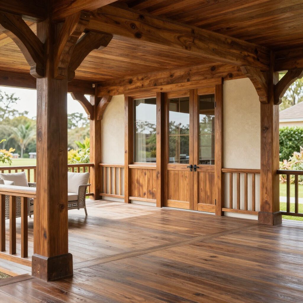 Een op maat gemaakte veranda met strakke lijnen en duurzame houtsoorten, perfect geïntegreerd in de tuin.