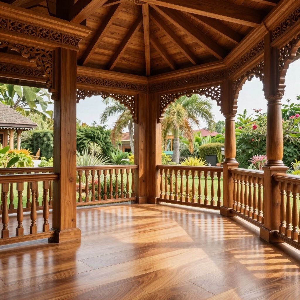 Een op maat gemaakte veranda met strakke lijnen en duurzame houtsoorten, perfect geïntegreerd in de tuin.